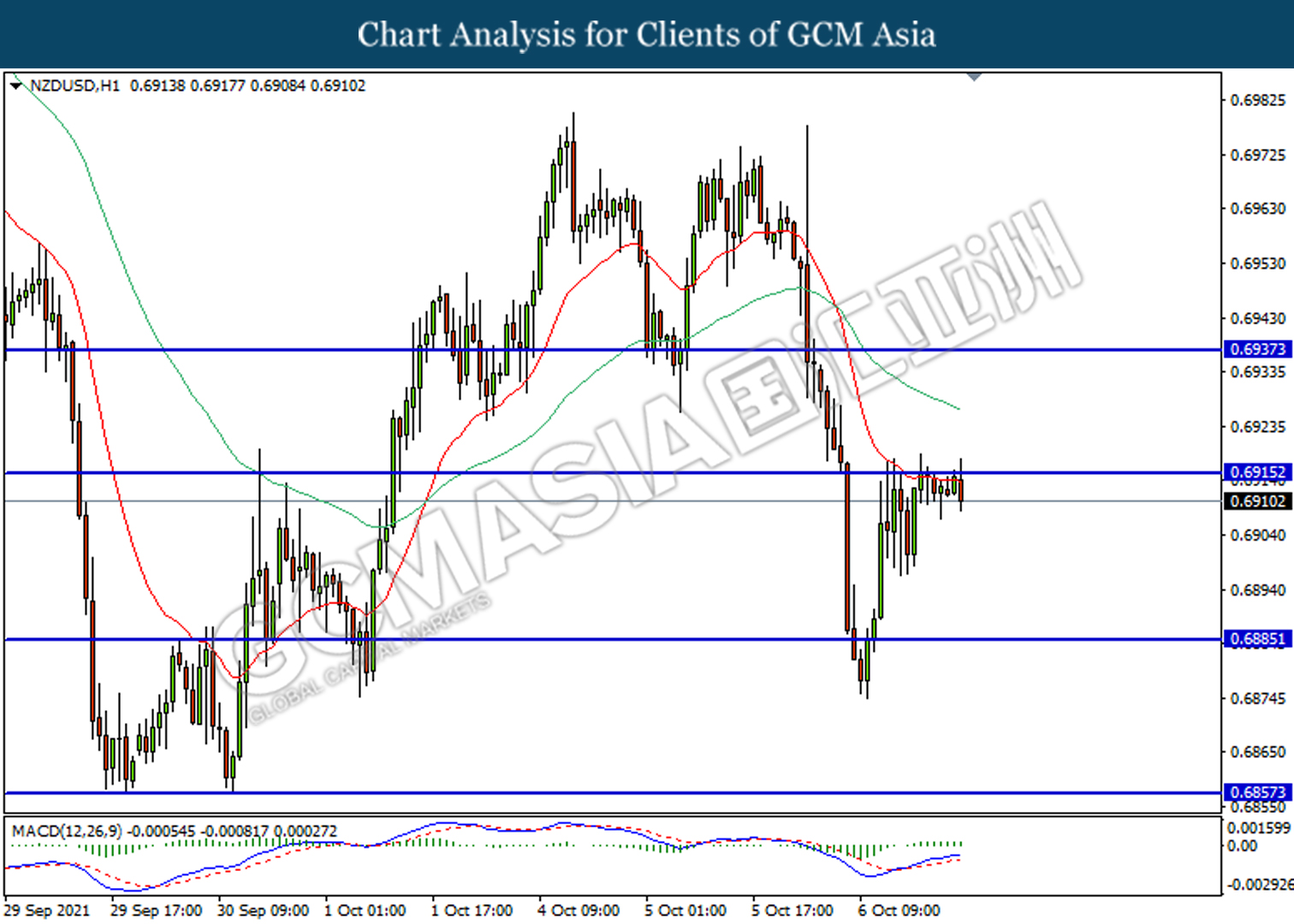 NZDUSD, H1: NZDUSD was traded higher while currently testing at the resistance of 0.6915. MACD which illustrate bullish signal suggests the pair to extend its gains after closing above the resistance level.