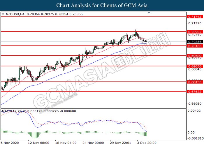 NZDUSD, H4: NZDUSD was traded lower following prior retracement from the resistance level at 0.7090. MACD which illustrate bearish bias momentum signal suggest the pair to extend its losses toward the support level at 0.7015.