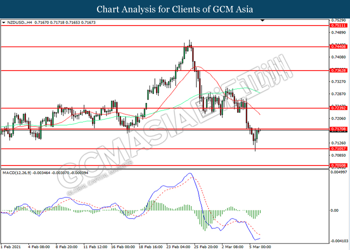 NZDUSD, H4: NZDUSD was traded higher while currently testing the resistance level at 0.7170. MACD which illustrated diminishing bearish momentum suggest the pair to extend its gains after it successfully breakout above the resistance level.