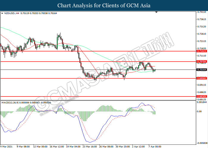 NZDUSD, H4: NZDUSD was traded lower following prior retracement from the resistance level at 0.7070. MACD which illustrated increasing bearish momentum suggest the pair to extend its losses toward support level at 0.6955.