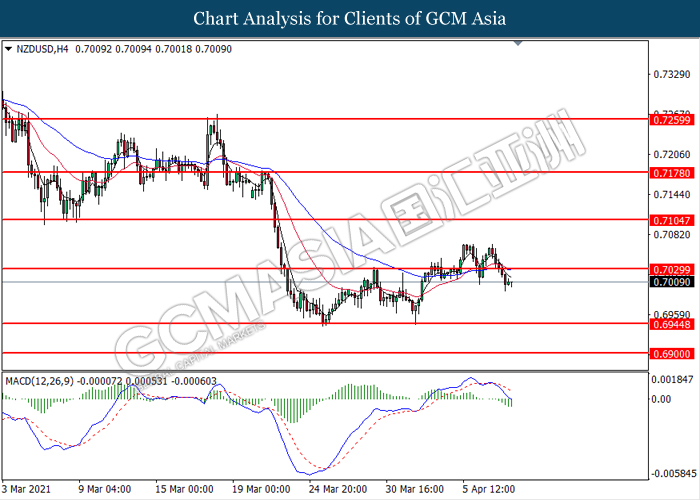 NZDUSD, H4: NZDUSD was traded lower following prior breakout below the previous support level at 0.7030. MACD which illustrated bearish bias momentum signal suggests the pair to extend its losses toward the support level at 0.6945.