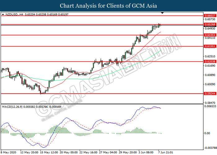NZDUSD, H4: NZDUSD was traded higher while currently testing the resistance level at 0.6525. However, MACD which illustrated increasing bearish momentum suggest the pair to be traded lower in short-term as technical correction.