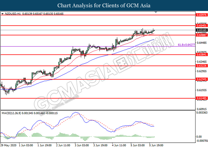 NZDUSD, H1: NZDUSD was traded higher following prior breakout above the previous resistance level at 0.6490. MACD which illustrates diminishing bearish momentum suggest the pair to extend its gains toward the resistance level at 0.6540.
