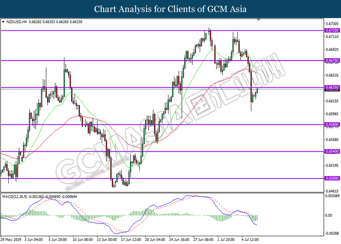 NZDUSD, H4: NZDUSD was traded higher while currently testing the resistance level 0.6635. MACD which illustrate diminishing bearish momentum suggest the pair to extend its gains after successfully breaking above the resistance level.