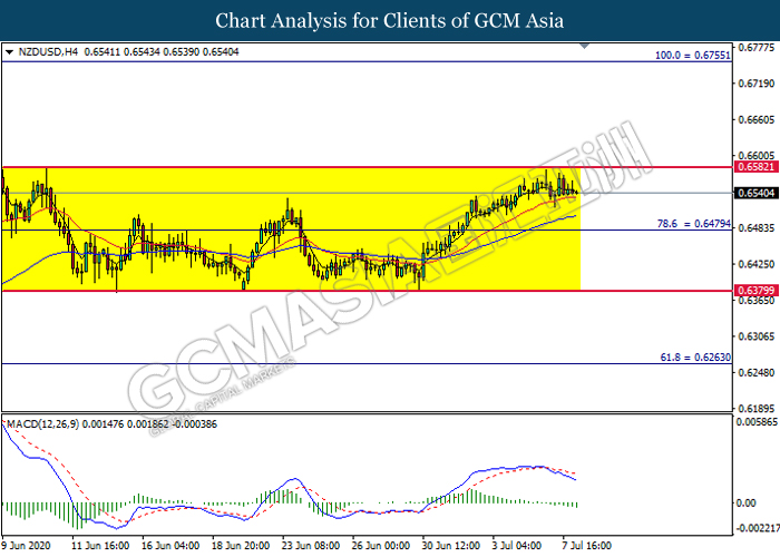 NZDUSD, H4: NZDUSD was traded lower following prior retracement from the resistance level at 0.6580. MACD which illustrate bearish bias momentum signal suggest the pair to extend its losses toward the support level at 0.6480.