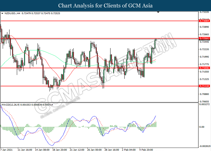 NZDUSD, H4: NZDUSD was traded higher while currently testing the resistance level at 0.7255. MACD which illustrated increasing bullish momentum suggest the pair to extend its gains after it successfully breakout above the resistance level.