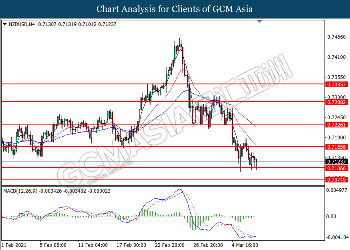 NZDUSD, H4: NZDUSD was traded lower while currently testing the support level at 0.7105. However, MACD which illustrated diminishing bearish momentum suggest the pair to undergo technical rebound in short term.