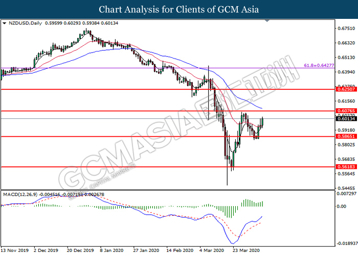 NZDUSD, Daily: NZDUSD was traded higher following prior rebound from the support level at 0.5865. MACD which illustrate bullish bias momentum suggest the pair to extend its gains toward the resistance level at 0.6075.