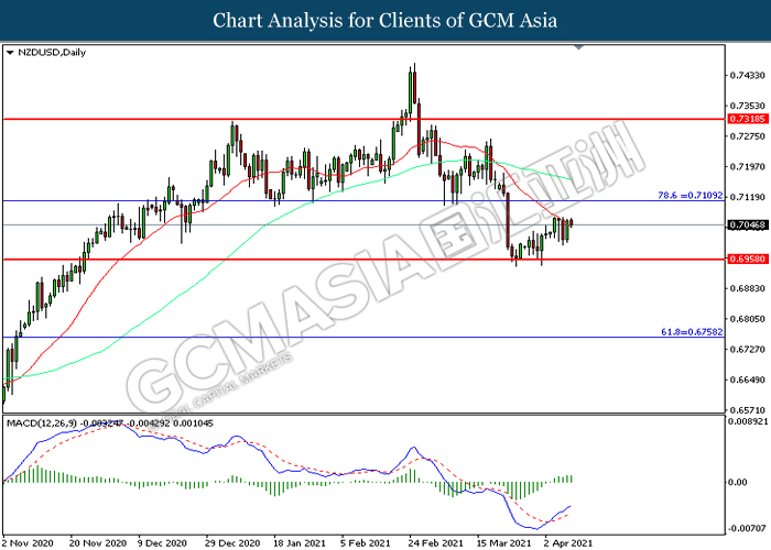 NZDUSD, Daily: NZDUSD was traded higher following prior rebound from the support level at 0.6960. MACD which illustrated increasing bullish momentum suggest the pair to extend its gains toward resistance level at 0.7110.