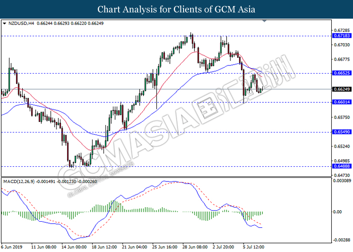 NZDUSD, H4: NZDUSD was traded lower following prior retracement from the resistance level 0.6650. However, MACD which illustrate bullish bias signal suggest the pair to experience a technical correction towards back the resistance level 0.6650.