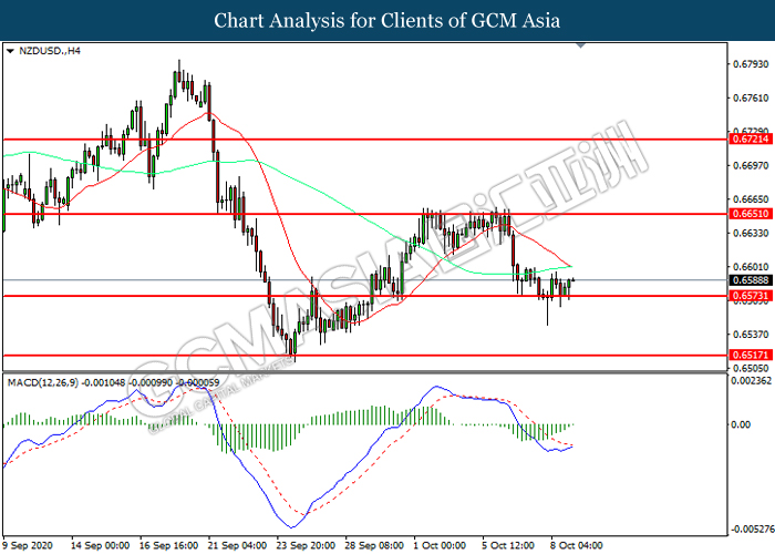 NZDUSD, H4: NZDUSD was traded lower while currently testing the support level at 0.6575. However, MACD which illustrated diminishing bearish momentum suggest the pair to be traded higher in short-term as technical correction.