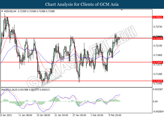 NZDUSD, H4: NZDUSD was traded higher while currently testing the resistance level at 0.7235. MACD which illustrated diminishing bullish momentum suggest the pair to undergo technical correction in short term.