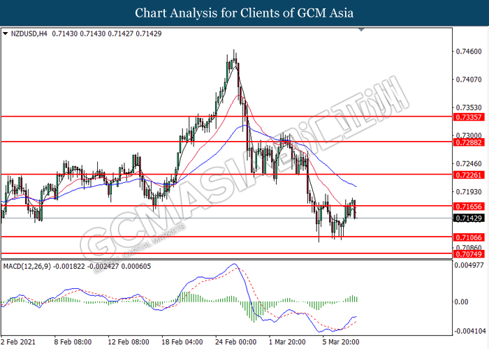 NZDUSD, H4: NZDUSD was traded lower following prior retracement near the resistance level at 0.7165. MACD which illustrated diminishing bullish momentum suggest the pair to extend its losses toward the support level at 0.7105.