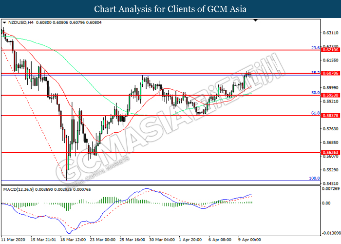 NZDUSD, H4: NZDUSD was traded higher while currently testing the resistance level at 0.6080. AMCD which illustrated increasing bullish momentum suggest the pair to extend its gains after it successfully breakout above the resistance level.
