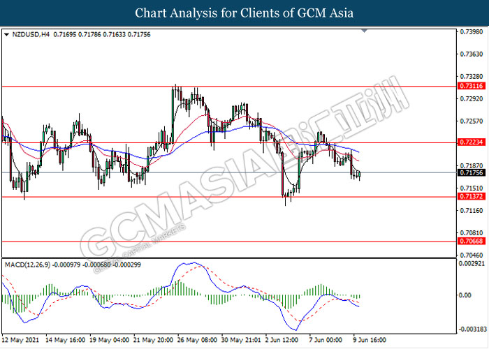NZDUSD, H4: NZDUSD was traded lower following prior retracement from the resistance level at 0.7225. MACD which illustrate bearish momentum signal suggest the pair to extend its losses toward support level at 0.7140.