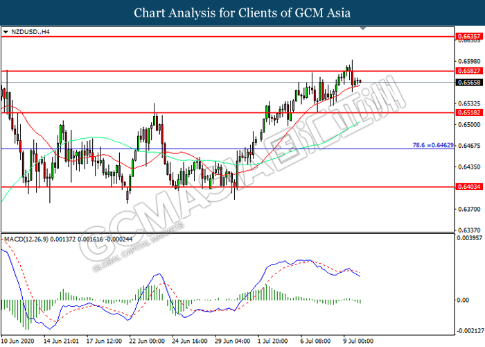 NZDUSD, H4: NZDUSD was traded lower following prior retracement from the resistance level at 0.6585. MACD which illustrated increasing bearish momentum suggest the pair to extend its losses toward support level at 0.9520.