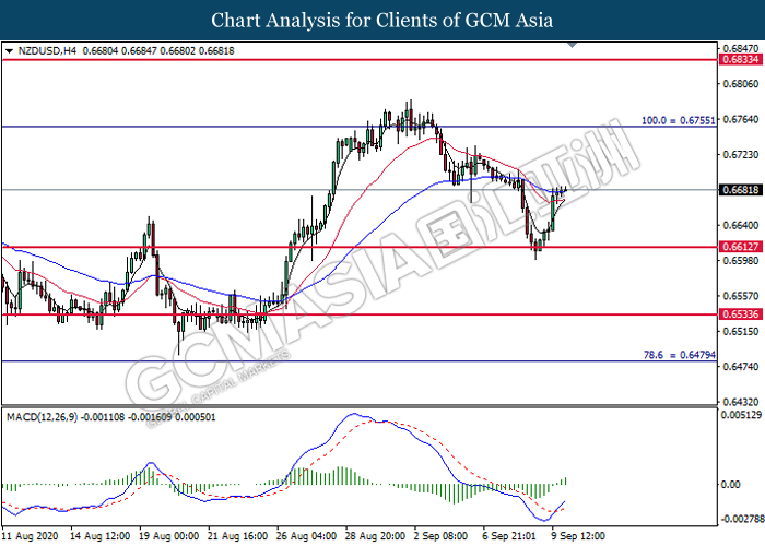 NZDUSD, Daily: NZDUSD was traded higher following prior rebound from the support level at 0.6615. MACD which illustrated bullish bias momentum suggest the pair to extend its gains toward the resistance level at 0.6755.