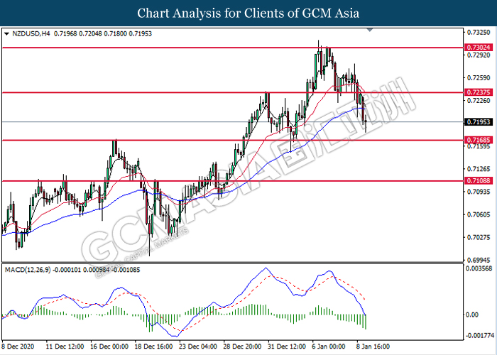 NZDUSD, H4: NZDUSD was traded lower following prior breakout below the previous support level at 0.7235. MACD which illustrated bearish bias momentum suggest the pair to extend its losses toward the support level at 0.7170.