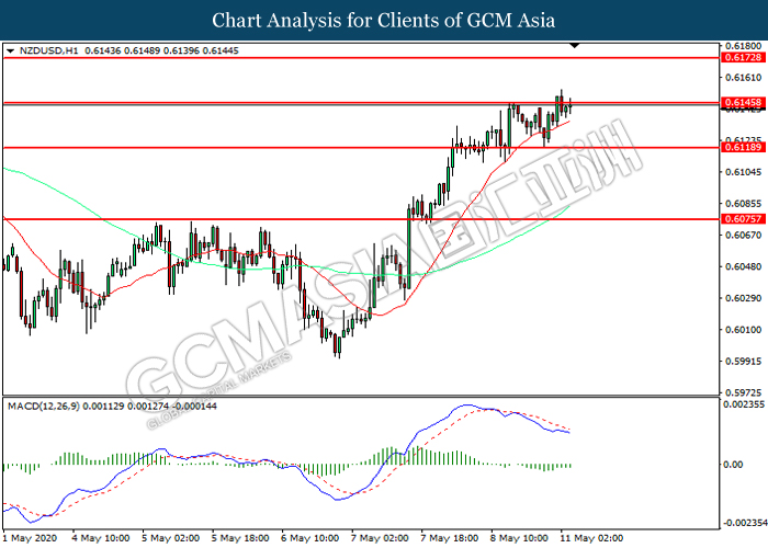 NZDUSD, H1: NZDUSD was traded higher while currently testing the resistance level at 0.6145. MACD which illustrated diminishing bearish momentum suggest the pair to extend its gains after it successfully breakout above the resistance level.