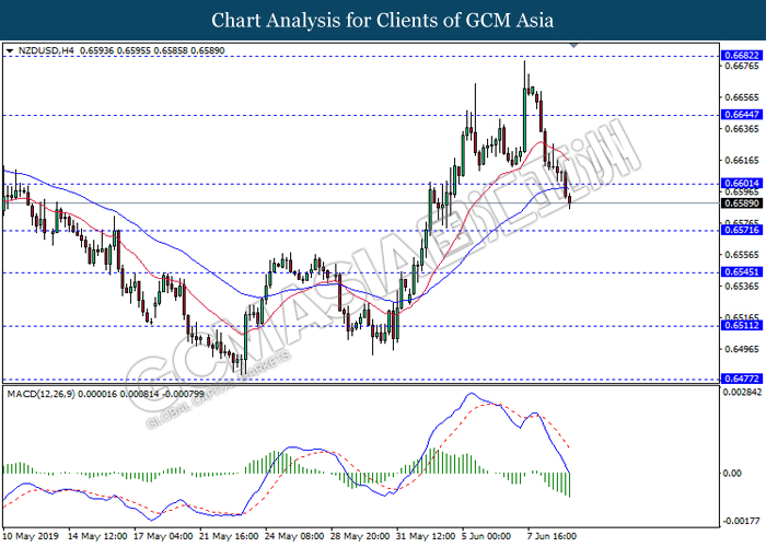 NZDUSD, H4: NZDUSD was traded lower following prior breakout below the previous support level 0.6600. MACD which illustrate persistent bearish bias signal suggest the pair to extend its losses towards the support level 0.6570