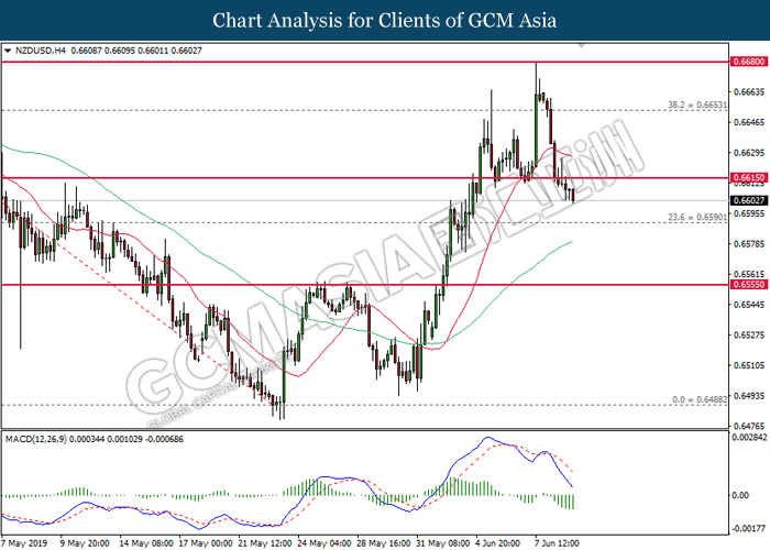 NZDUSD, H4: NZDUSD was traded lower following prior closure below 0.6615. MACD which illustrate bearish signal suggests the pair to extend its losses, towards the direction of 0.6590.