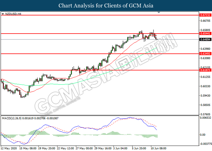 NZDUSD, H4: NZDUSD was traded lower following prior retracement from the resistance level at 0.6545. MACD which illustrated increasing bearish momentum suggest the pair to extend its losses toward support level at 0.6350.