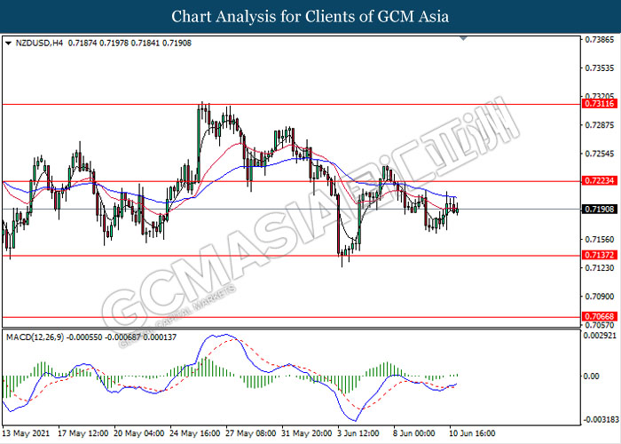 NZDUSD, H4: NZDUSD was traded higher following recent rebound from its low level. MACD which illustrate bullish momentum signal with the formation of golden cross suggest the pair to extend its rebound towards the resistance level 0.7225.