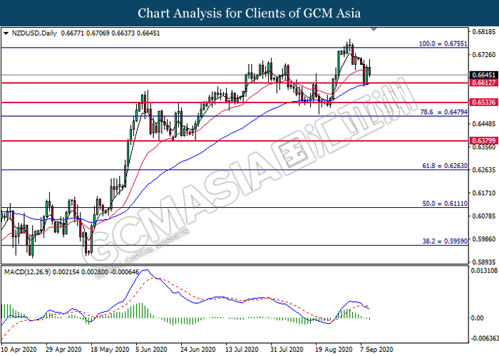 NZDUSD, Daily: NZDUSD was traded higher following prior rebound from the support level at 0.6615. However, MACD which illustrated bearish momentum with the formation of death cross suggest the pair to undergo technical correction toward the support level at 0.6615.