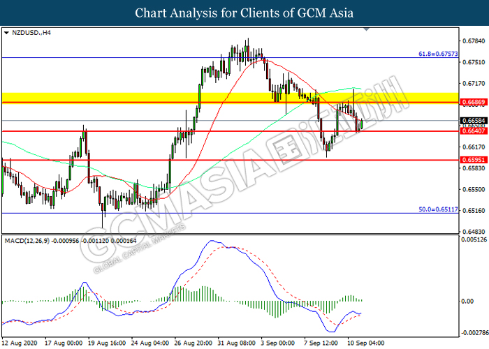 NZDUSD, H4: NZDUSD was traded higher following prior rebound from the support level at 0.6640. However, MACD which illustrated diminishing bullish momentum suggest the pair to be traded lower in short-term as technical correction.