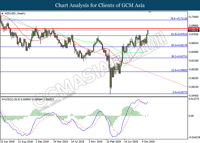 NZDUSD, Weekly: NZDUSD was traded higher while currently testing the resistance level at 0.6915. MACD which illustrated increasing bullish momentum suggest the pair to extend its gains after it successfully breakout above the resistance level.