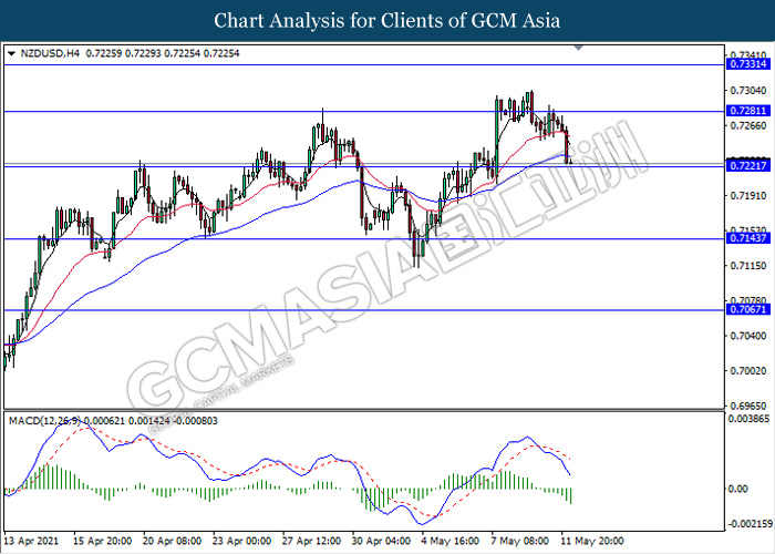 NZDUSD, H4: NZDUSD was traded lower while currently testing the support level 0.7220. MACD which illustrate bearish bias signal with the recent formation of death cross suggest the pair to extend its losses after it breaks below the support level.