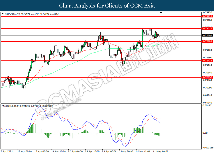 NZDUSD, H4: NZDUSD was traded lower following prior retracement from the resistance level at 0.7300. MACD which illustrated increasing bullish momentum suggest the pair to extend its losses toward support level at 0.7240.
