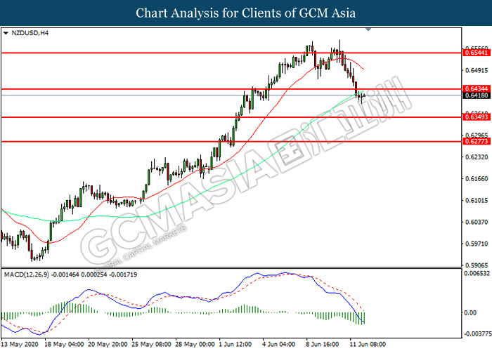 NZDUSD, H4: NZDUSD was traded lower following prior breakout below the previous support level 0.6435. However, MACD which illustrated diminishing bearish momentum suggest the pair to be traded higher in short-term as technical correction.