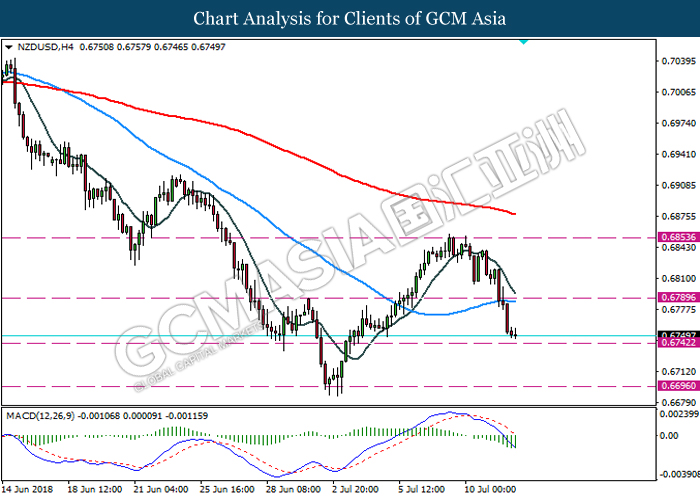 NZDUSD, H4: NZDUSD was traded lower while currently retest the support line 0.6740. Recent price actions and MACD display an ongoing downward momentum with a bearish crossover suggest the pair could extend its losses after break below the support level of 0.6740 for confirmation.