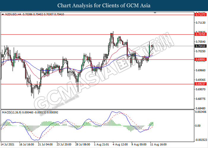 NZDUSD, H4: NZDUSD was traded higher following prior rebound form the support level 0.7000. MACD which illustrate bullish bias signal suggest the pair to extend its gains towards the resistance level 0.7075.