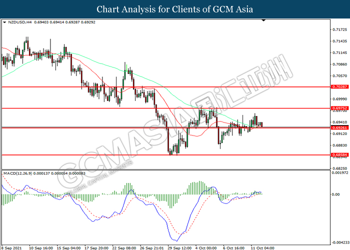 NZDUSD, H4: NZDUSD was traded lower while currently testing the support level at 0.6925. MACD which illustrated diminishing bullish momentum suggest the pair to extend its losses after it successfully breakout below the support level.