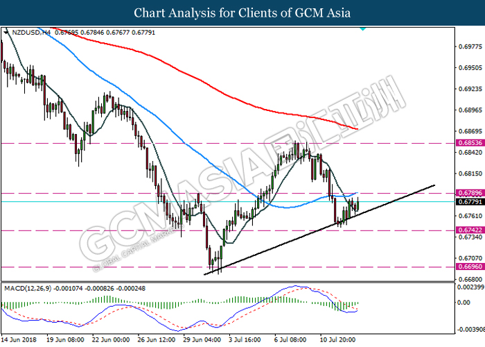 NZDUSD, H4: NZDUSD was traded higher following recent rebound from the trend line. Recent price action and MACD which indicate formation of upward momentum with bullish divergence suggest the pair could extend its gains after it breaks above the support line 0.6790