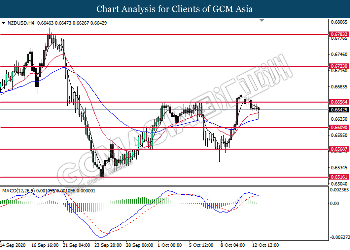 NZDUSD, H4: NZDUSD was traded lower following prior retracement from the resistance level at 0.6655. MACD which illustrate diminishing bullish momentum signal suggest the pair to extend its losses toward the support level at 0.6610.