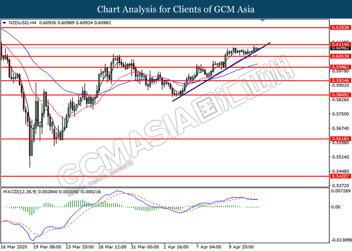 NZDUSD, H4: NZDUSD was traded higher following prior rebound from the upward trendline. MACD which illustrate diminishing bearish momentum suggest the pair to extend its gains toward the resistance level at 0.6115.