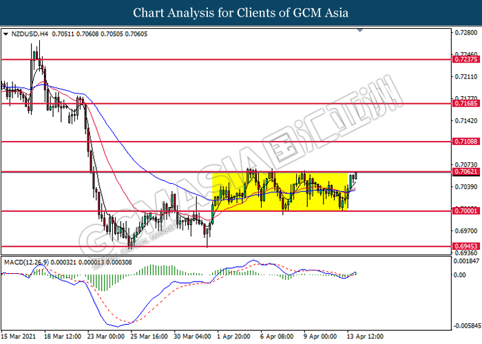 NZDUSD, H4: NZDUSD was traded higher while currently testing the resistance level at 0.7060. MACD which illustrated bullish bias momentum signal suggests the pair to extend its gains after it successfully breakout above the resistance level.