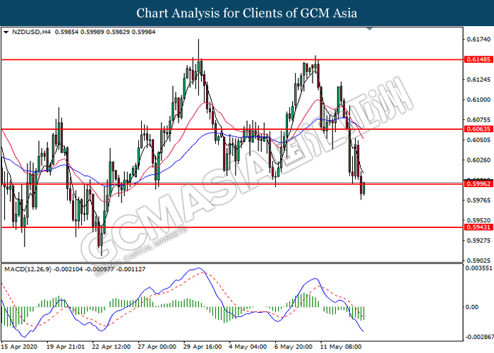 NZDUSD, H4: NZDUSD was traded lower following prior breakout below the previous support level at 0.5995. MACD which illustrates bearish bias momentum suggest the pair to extend its losses toward the support level at 0.5945.