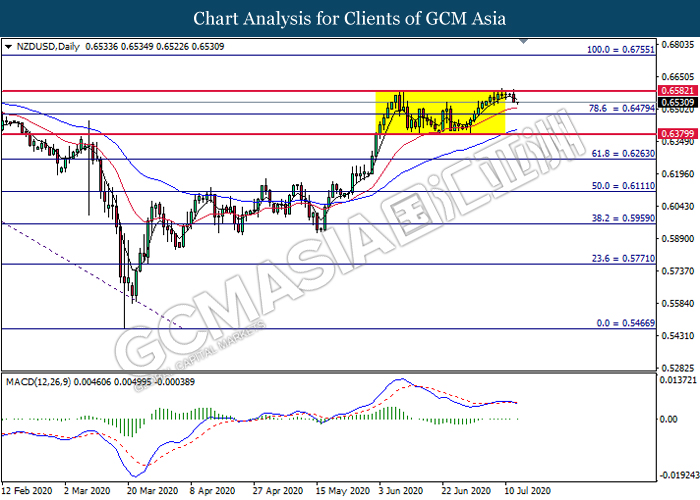 NZDUSD, Daily: NZDUSD was traded lower following prior retracement from the resistance level at 0.6580. MACD which illustrate bearish momentum signal suggest the pair to extend its losses toward the support level at 0.6380.