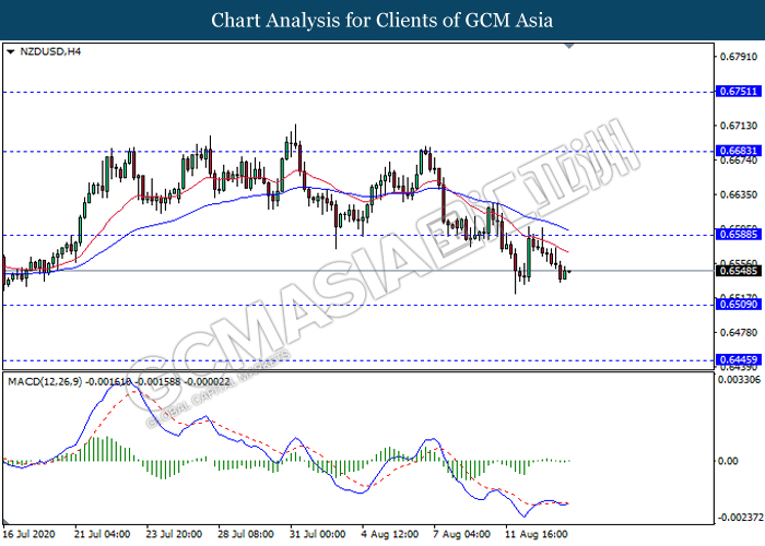 NZDUSD, H4: NZDUSD was traded lower following recent retracement from the resistance level 0.6590. MACD which illustrate bearish bias suggest the pair to extend its losses in short term towards the support level 0.6510.