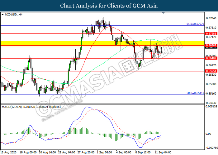 NZDUSD, H4: NZDUSD was traded higher while currently testing the resistance level at 0.6685. MACD which illustrated increasing bullish momentum suggest the pair to extend its gains after it successfully breakout above the resistance level.
