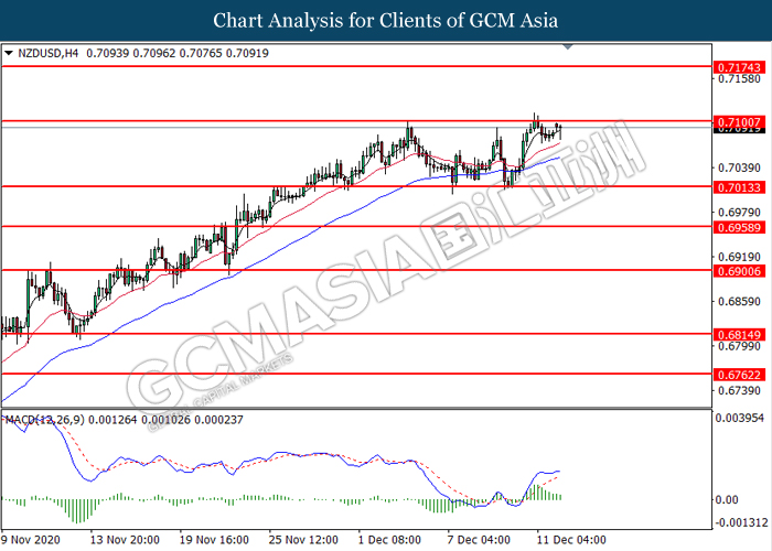 NZDUSD, H4: NZDUSD was traded higher while currently testing the resistance level at 0.7100.  However, MACD which illustrate diminishing bullish momentum signal suggest the pair to undergo technical correction in short term.