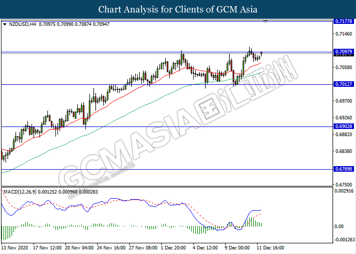 NZDUSD, H4: NZDUSD was traded higher while currently testing the resistance level 0.7095. However, MACD which illustrate diminishing bullish momentum signal suggest the pair to be traded lower as a technical correction towards the support level 0.7010.