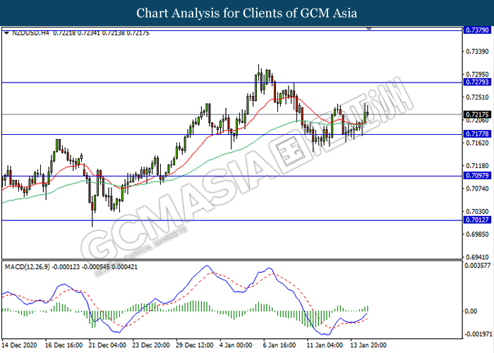 NZDUSD, H4: NZDUSD was traded higher following prior rebound from the support level 0.7175. MACD which illustrate bullish momentum signal suggest the pair to extend its rebound towards the resistance level 0.7280.
