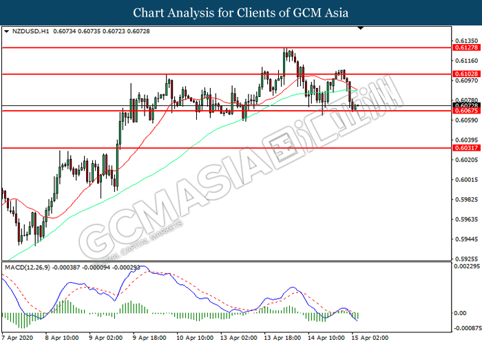 NZDUSD, H1: NZDUSD was traded lower while currently testing the support level at 0.6065. MACD which illustrated increasing bearish momentum suggest the pair to extend its losses after it successfully breakout below the support level.