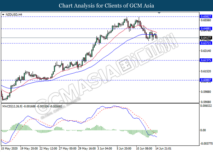 NZDUSD, H4: NZDUSD was traded flat in a tight range while currently testing near the support level 0.6370. However, MACD which illustrate bearish momentum signal suggest the pair to be traded lower after it breaks below the support level.
