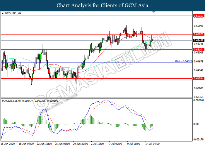 NZDUSD, H4: NZDUSD was traded higher following prior rebound from the support level at 0.6510. MACD which illustrated diminishing bearish momentum suggest the pair to extend its gains toward resistance level at 0.6565.